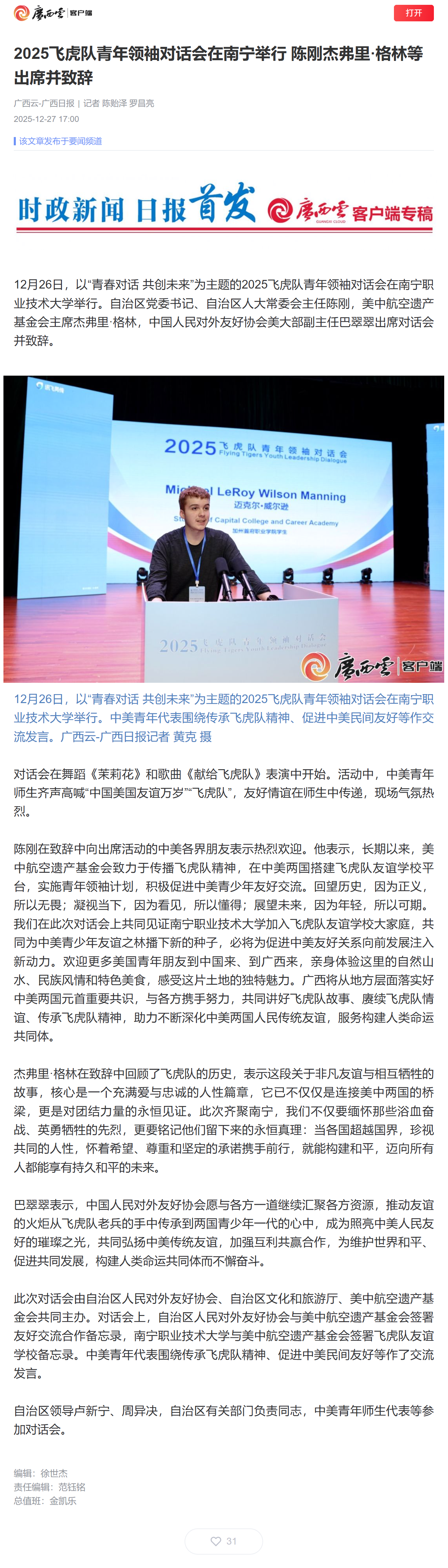 2025飞虎队青年领袖对话会在南宁举行 陈刚 杰弗里·格林等出席并致辞