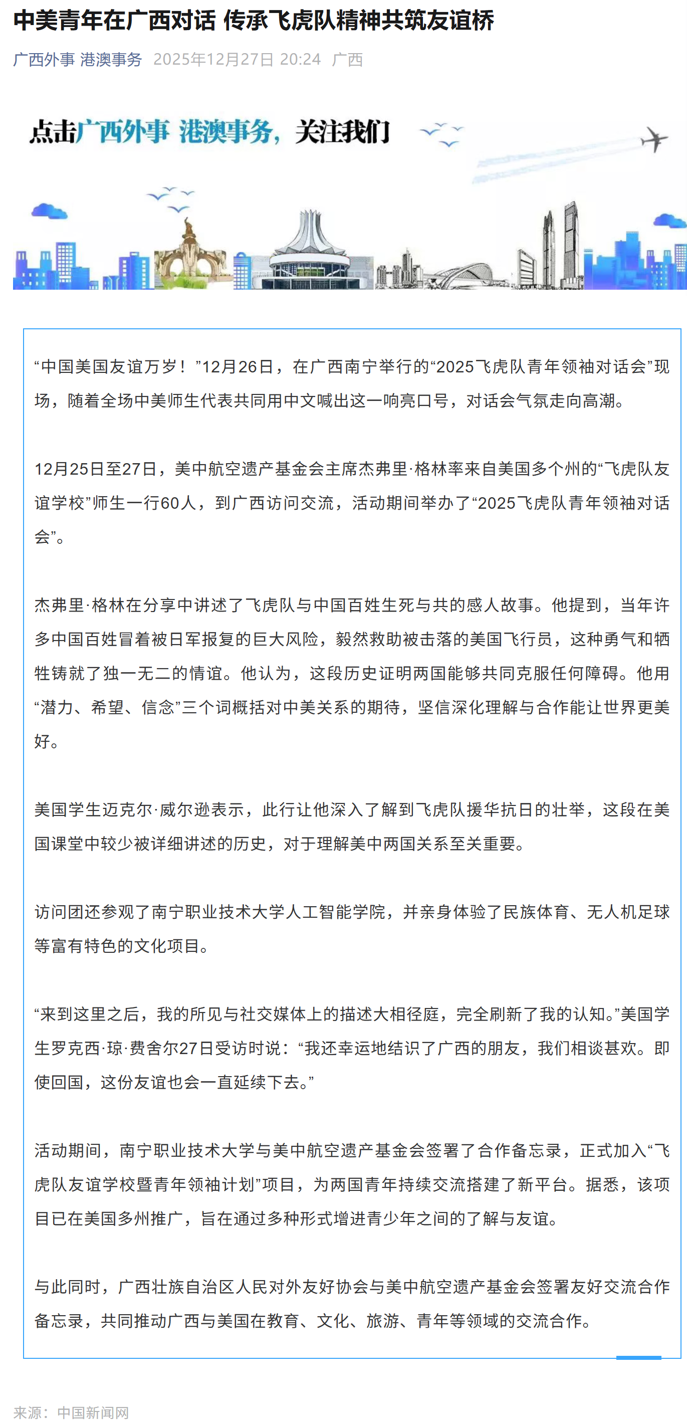 中美青年在广西对话 传承飞虎队精神共筑友谊桥