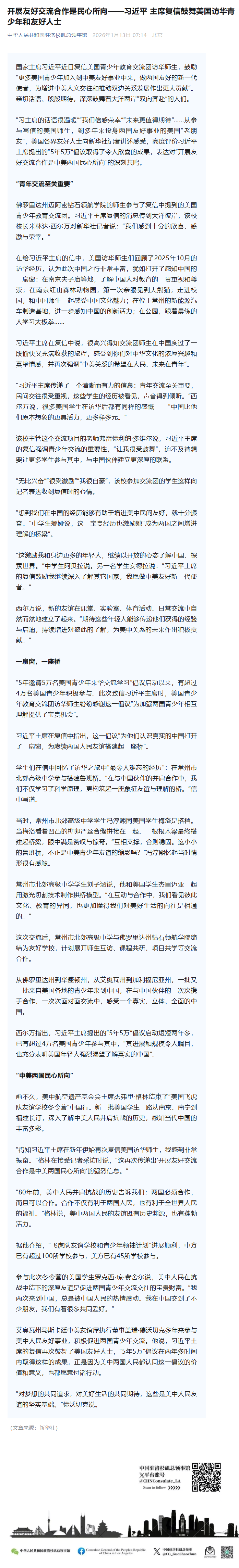 开展友好交流合作是民心所向——习近平主席复信鼓舞美国访华青少年和友好人士