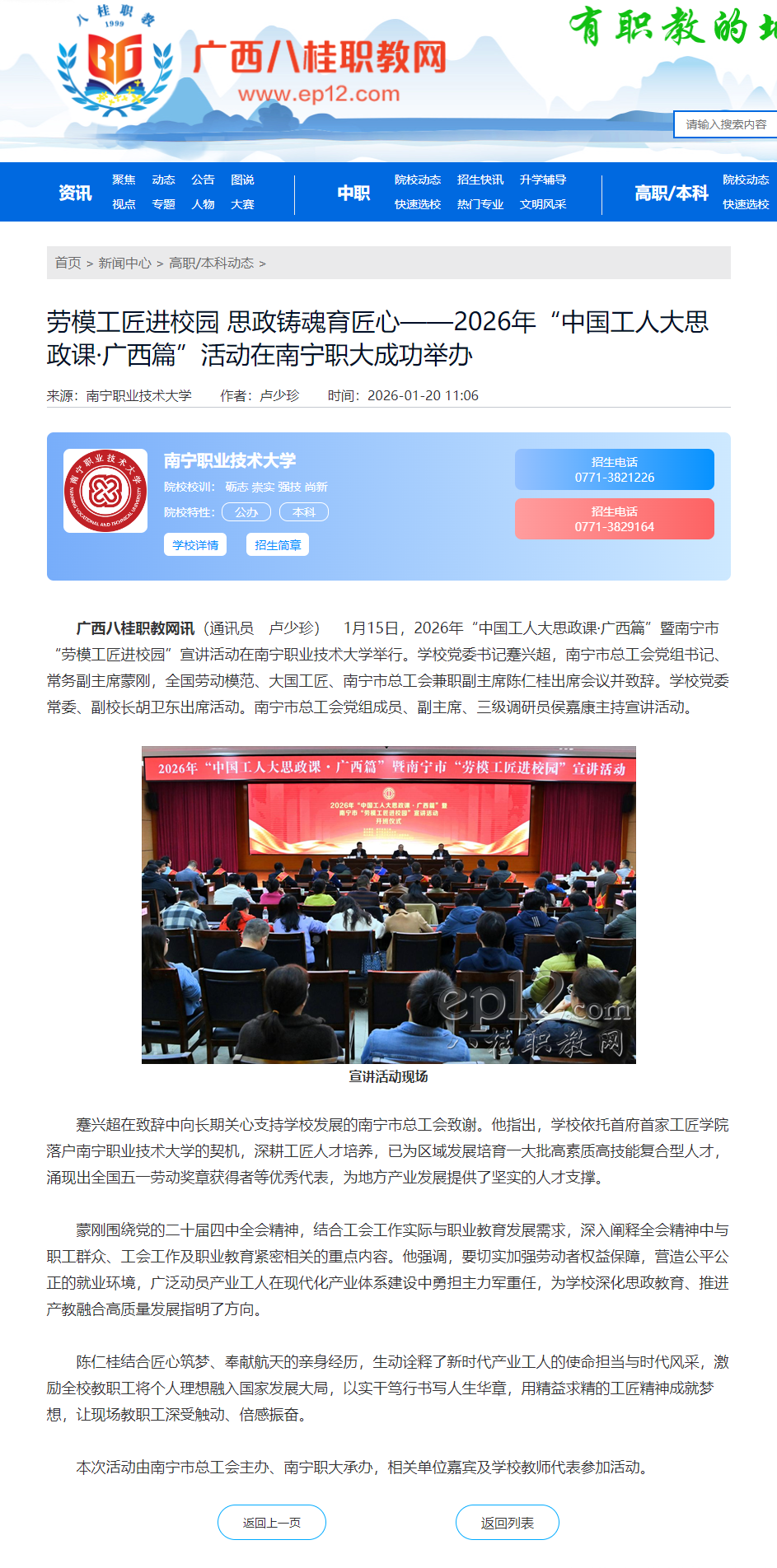 上一条: 数智深耕 匠造未来——广西高等教育学会人工智能与机器人专业委员会2025年度学术年会暨教师素养提升培训班在南宁职大举行