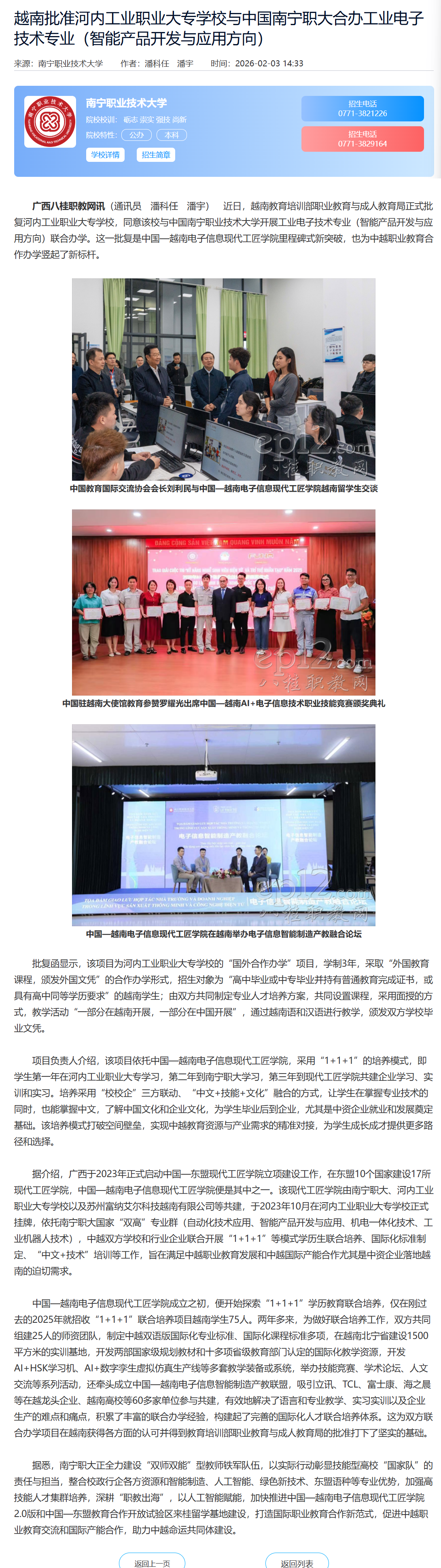 下一条:越南教育培训部职业教育与成人教育局正式批复河内工业职业大专学校与中国南宁职业技术大学开展工业电子技术专业(智能产品开发与应用方向)联合办学