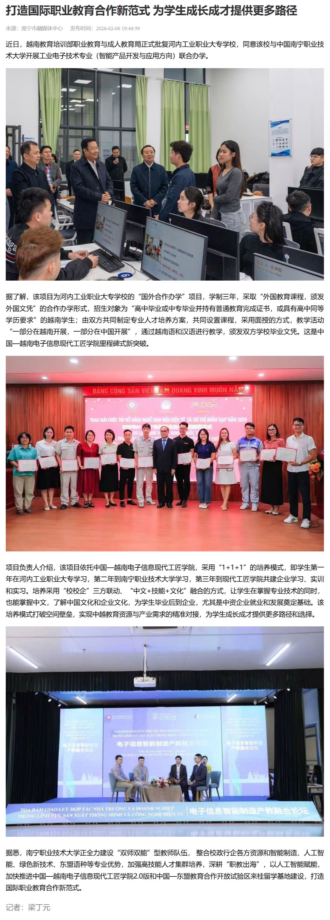 【职教出海】越南教育培训部职业教育与成人教育局正式批复河内工业职业大专学校与中国南宁职业技术大学开展工业电子技术专业(智能产品开发与应用方向)联合办学