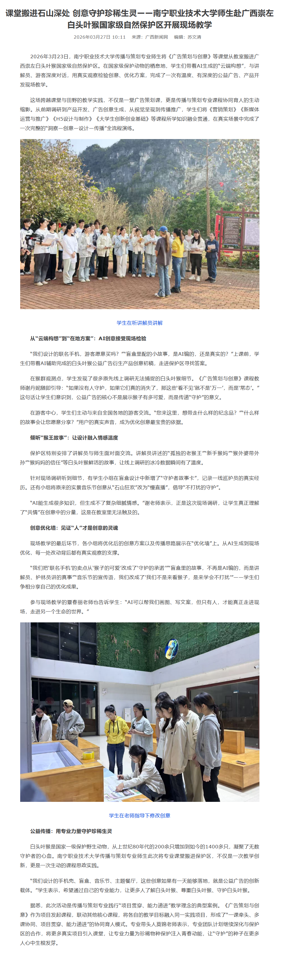 课堂搬进石山深处 创意守护珍稀生灵——南宁职业技术大学师生赴广西崇左白头叶猴国家级自然保护区开展现场教学