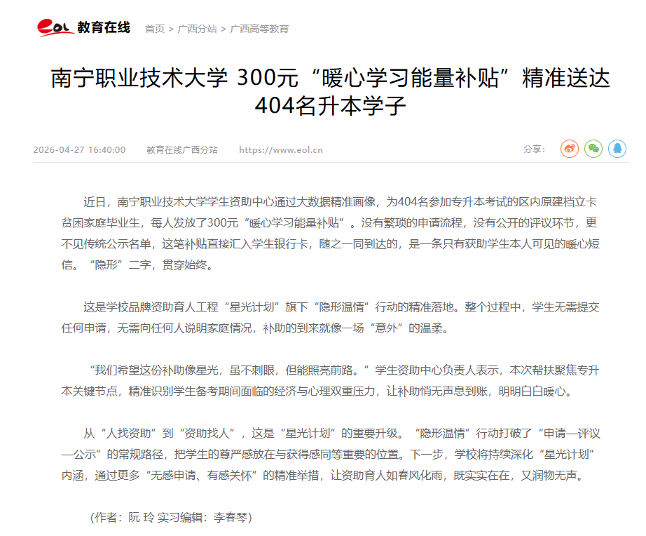 南宁职业技术大学 300元“暖心学习能量补贴”精准送达404名升本学子