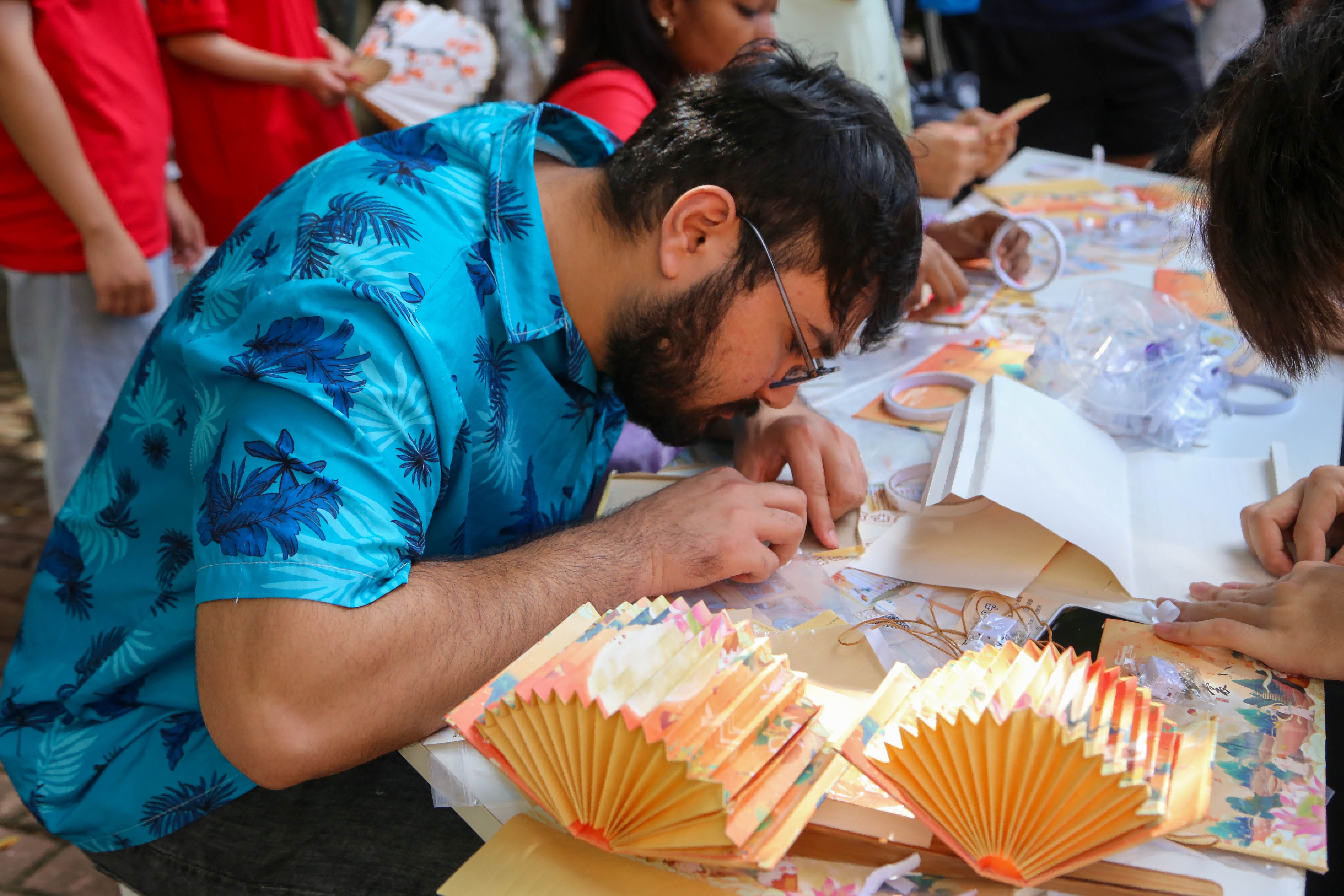 本次展览的核心由6个特色展位构成,国际学院各专业学生学以致用,将专业理论知识转化为生动的文化实践。应用泰语专业的学生们身着精美的泰国传统服饰,用泰语书写对亲人的祝福;应用越南语专业的展位前,地道的越南春卷和咖啡香气四溢,吸引了众多师生品尝;商务英语和国际商务专业的同学们则分区域展示了新加坡的现代都市文化与印度尼西亚的特色美食;学前教育专业的同学们在中国非遗体验区引导观众体验猜灯谜、中国剪纸和书灯制作……中外师生不仅是文化的展示者,更是跨越国界的友谊使者,他们运用精湛的语言技能生动解说,使每个展位都成为互动交流的活跃节点。