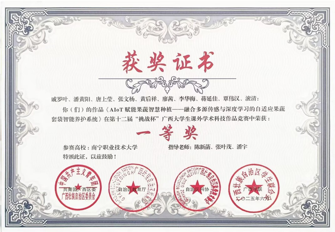 第十二届“挑战杯”广西大学生课外学术科技作品竞赛获奖证书(智能工程学院潘宇供图)