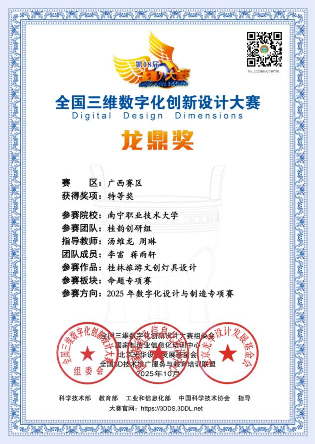 近日,第18届全国三维数字化创新设计大赛数字化设计与制造专项赛(广西赛)落幕,我校艺术与传媒学院家具艺术设计专业学生李富、蒋雨轩的“桂韵创研组”桂林旅游文创灯具设计作品,在指导教师汤维龙、周琳的悉心指导下,凭借出色发挥斩获本科组特等奖,并获国赛资格。