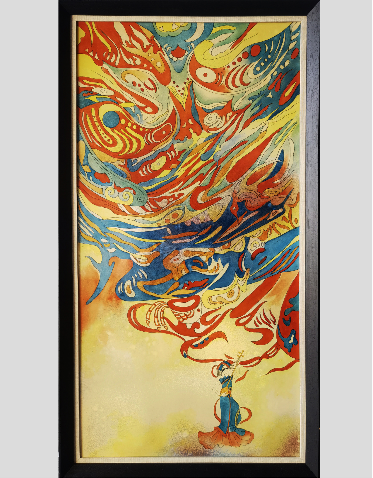 由我校通识教育学院教师曹现果指导、学生黄水凤创作的作品《壮音叮鼎》入选本次作品展。作品以瓷板画传统技艺为载体,描绘了天琴琴声“叮咚”清越,乐音婉转悠扬,引得百鸟相汇的景象。作品大面积采用艺术化处理的鸟纹、云纹,与弹天琴的姑娘形成鲜明对比。技法方面,运用变化丰富的颜色釉与以红、黄、蓝为主要色调的釉上彩绘交相呼应,表现出浓厚的壮乡韵味。