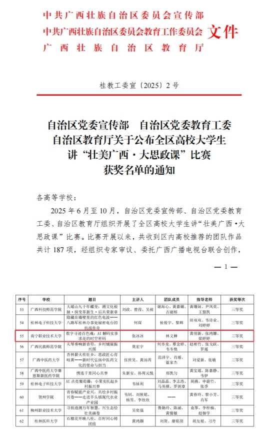 近日,自治区党委宣传部、自治区党委教育工委、自治区教育厅公布全区高校大学生讲“壮美广西·大思政课”比赛获奖名单。我校马克思主义学院黄羽新、张鸿娜、梁婷婷三位教师组队指导24级旅游管理4班学生张冰冰、林义婵完成的作品《数字寻迹百色魂:AI解码实事求是的时空密码》在比赛中喜获本科组三等奖。