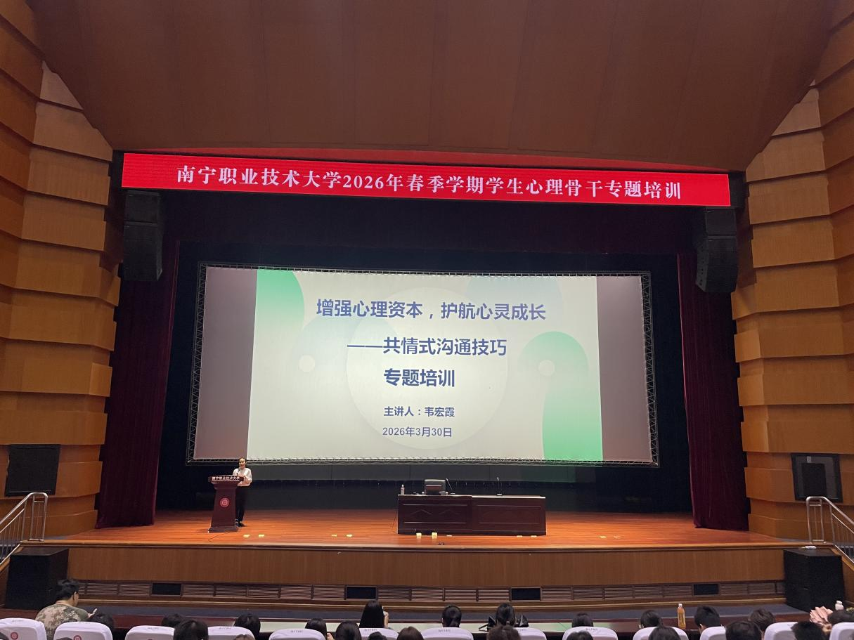 为进一步提升我校学生心理骨干的专业素养与助人能力,筑牢校园心理健康防护网,3月30日,我校在学校会议中心大礼堂成功举办“增强心理资本,护航心灵成长——学生心理骨干共情式沟通技巧”专题培训。全校各班级心理委员、心理安全员共同参与本次培训。