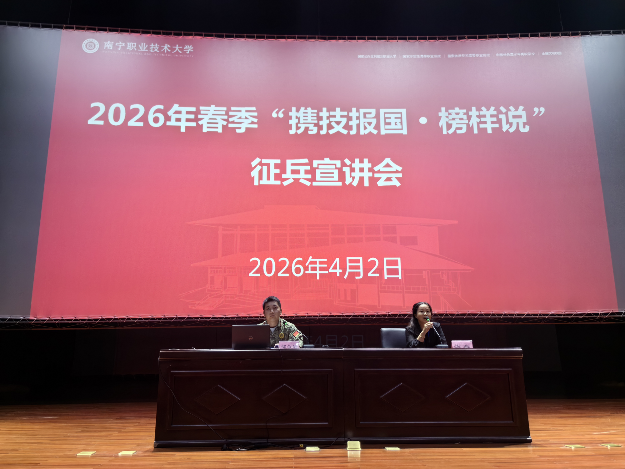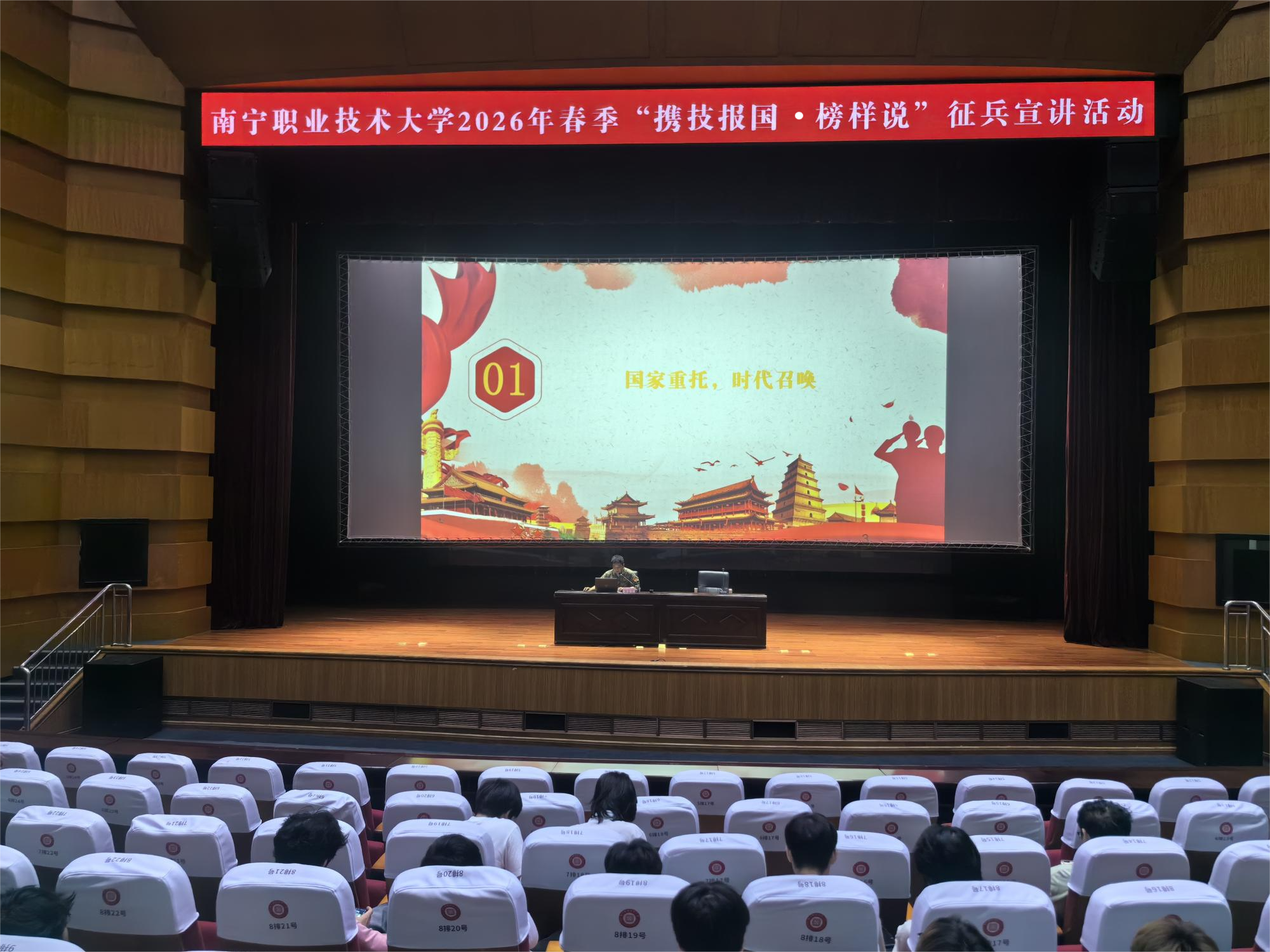 为激发青年学子参军报国的热情,鼓励学生携技投身军营、建功立业,4月2日下午,我校在会议中心一号厅举办2026年春季“携技报国·榜样说”征兵宣讲活动。南宁市西乡塘区人民武装部邹金员、蒋燕应邀到校宣讲,各学院征兵工作负责人、2024级男生代表及2025级有参军意向学生共700余人参加活动。