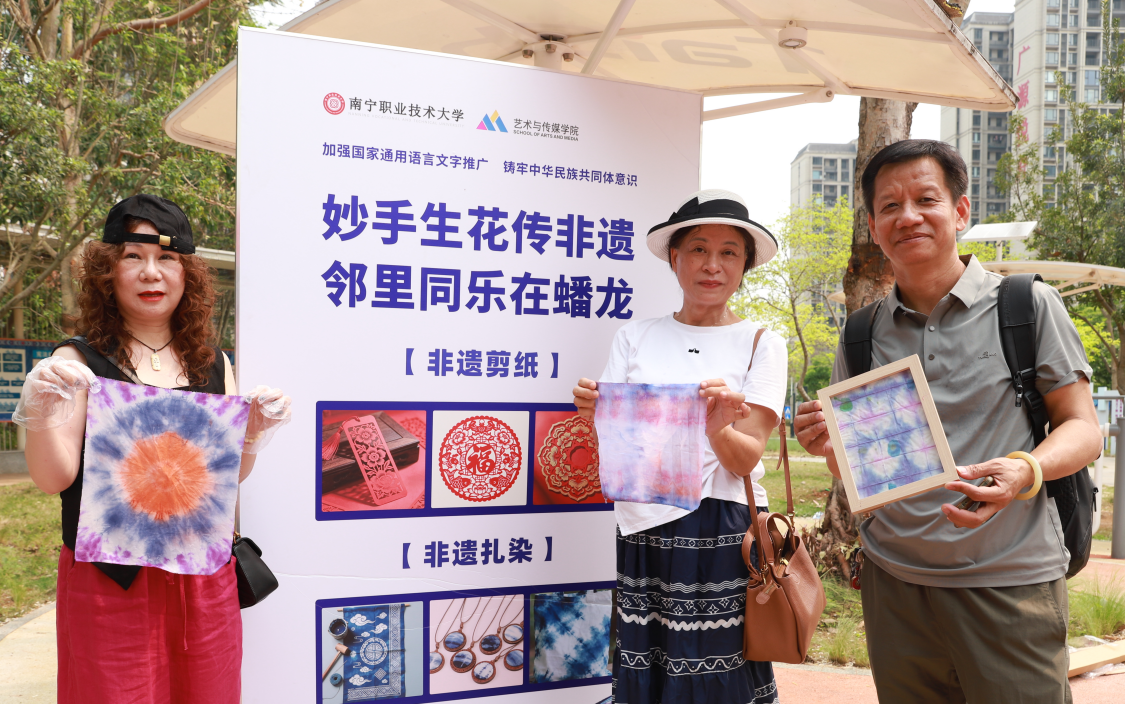 活动中,来自南宁职业技术大学艺术与传媒学院的师生为社区居民现场展示了传统剪纸和民族扎染等非遗技艺,同时展出了与龙州县水口镇共和完全小学师生设计的壮锦文创产品,吸引了大批观众驻足观赏、体验。