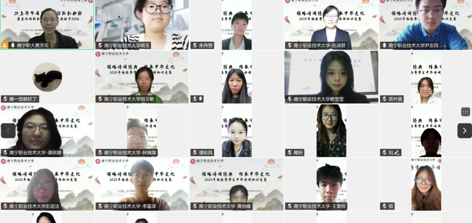 为弘扬中华优秀传统文化,激发桂港粤三地学生对诗词的兴趣与热爱,提升学生的文化素养,11月8日,南宁职业技术大学、桂港现代职业教育发展中心、广西国际友城职业教育联盟联合主办2025年“领略诗词经典 传承中华文化”桂港粤学生中华诗词知识竞赛,吸引桂港粤三地300余名大学生参赛。