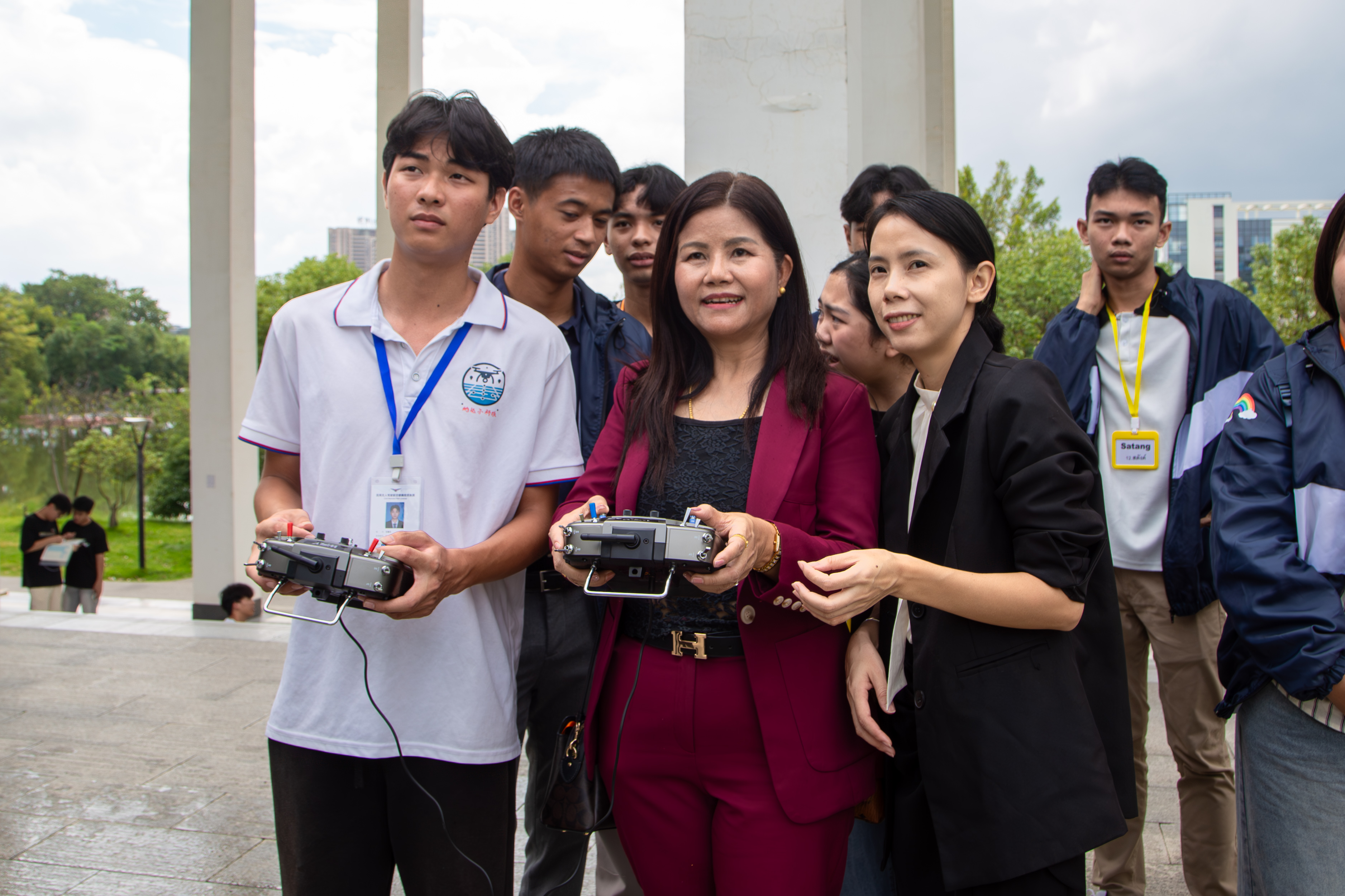 实操体验环节成为活动的“人气焦点”。在技术人员的一对一指导下,泰国学生分组上阵,手握遥控器完成无人机起飞、转向、定点降落等基础操作。初次操控无人机的查雅努・苏茶娣博士难掩兴奋:“第一次让无人机飞起来的时候特别紧张,在教员的帮助下成功完成动作,感觉像实现了‘飞行梦想’。”