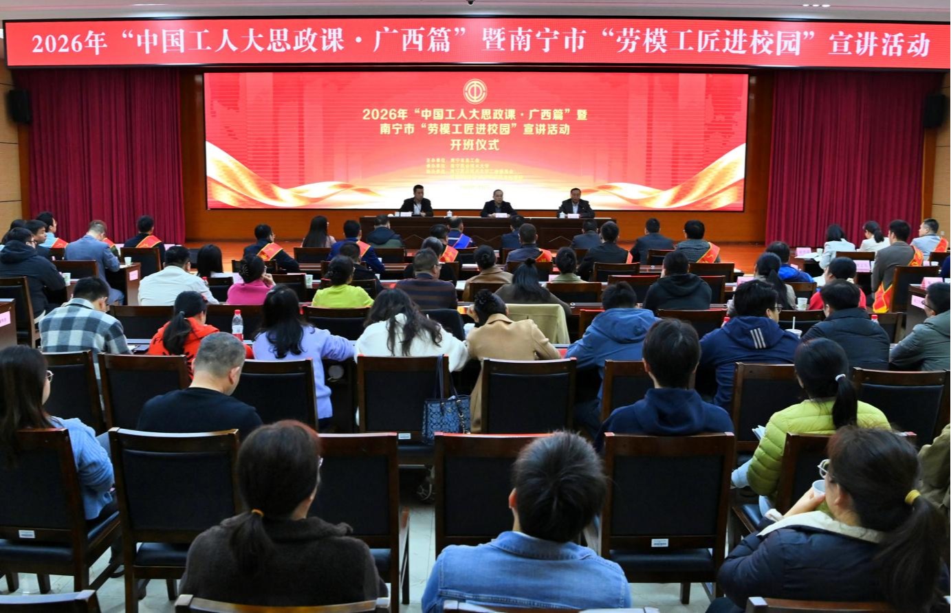 1月15日,2026年“中国工人大思政课·广西篇”暨南宁市“劳模工匠进校园”宣讲活动在南宁职业技术大学举行。学校党委书记蹇兴超,南宁市总工会党组书记、常务副主席蒙刚,全国劳动模范、大国工匠、南宁市总工会兼职副主席陈仁桂出席会议并致辞。学校党委常委、副校长胡卫东出席活动。南宁市总工会党组成员、副主席、三级调研员侯嘉康主持宣讲活动。