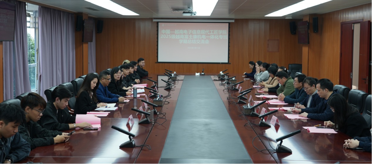 1月15日下午,中国—越南电子信息现代工匠学院2025级越南富士康机电一体化专班学期总结交流会在南宁职业技术大学第一会议室举行。学校党委常委、副校长李东升,富士康南宁园区相关领导,学校教师代表以及工匠学院2024级、2025级越南留学生共同参加此次活动。