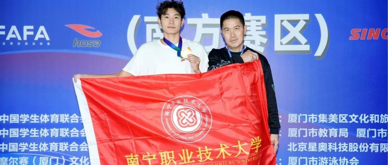11月12日,第24届中国大学生游泳锦标赛(南方赛区)在厦门奥体中心白海豚游泳馆圆满落幕。本次赛事吸引了包括复旦大学、浙江大学、上海交通大学、深圳职业技术大学等在内的105所高校、800余名运动员参与,参赛规模创历史新高。在我校通识教育学院教师何飞、赖永军的悉心指导下,来自艺术与传媒学院的陈增辉同学发挥出色,勇夺400米自由泳冠军并打破自己保持的全国纪录,成功闯进全国总决赛。同时,该同学成功入选第十五届全国运动会广西代表队,将代表广西出征更高水平的竞技舞台。